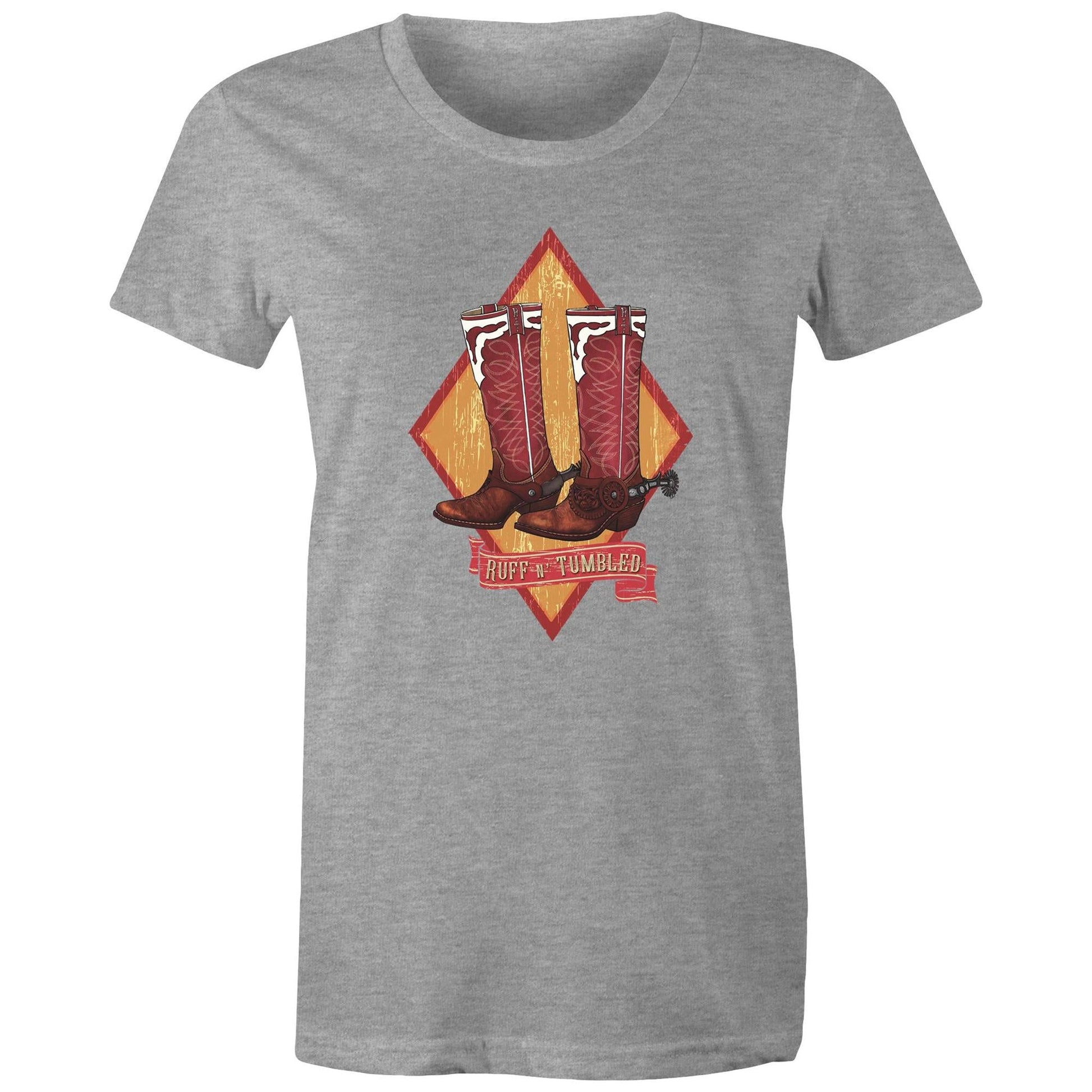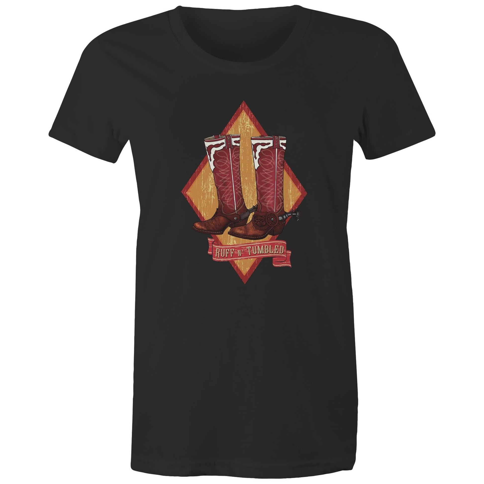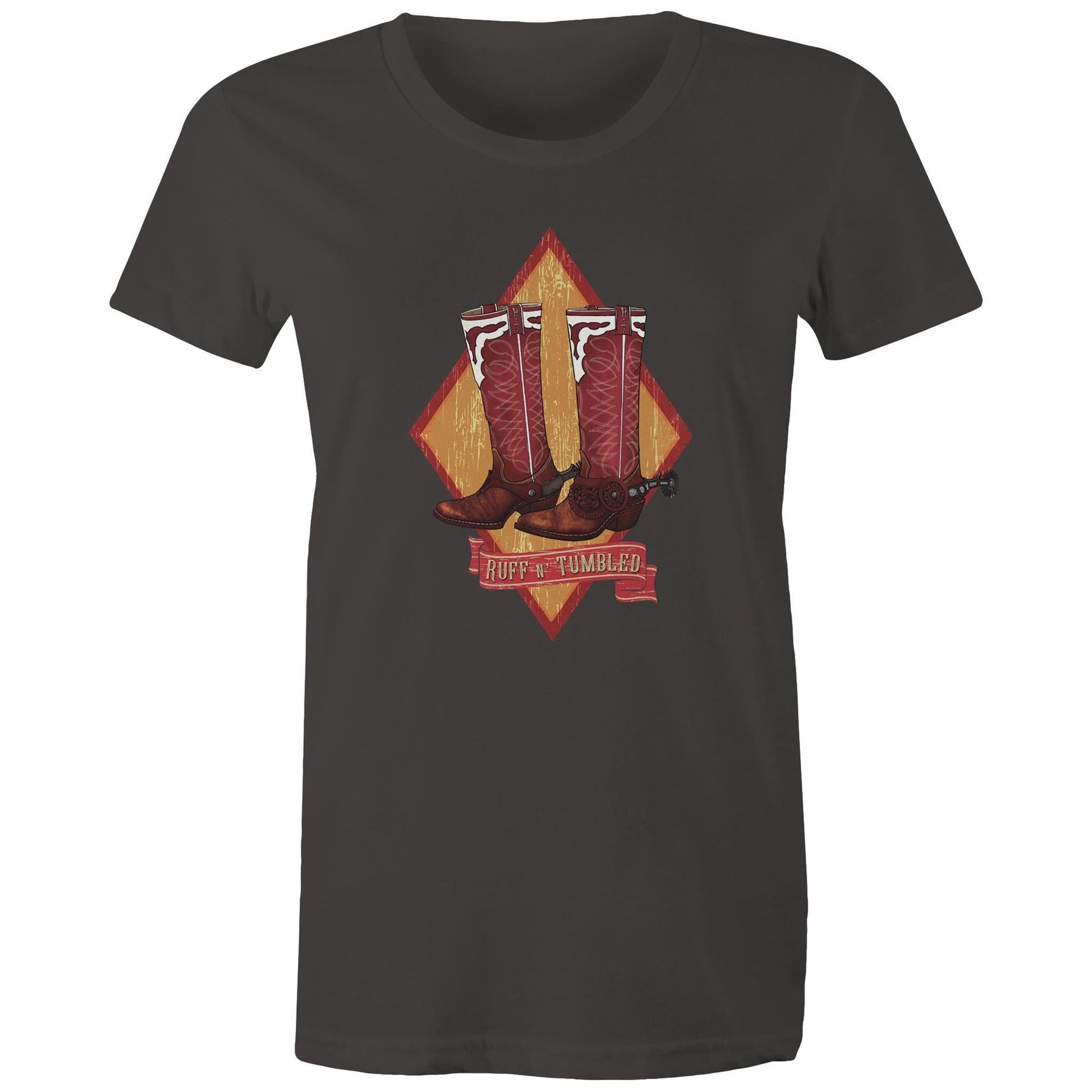 Keep it ranchy in this womens western T-shirt printed with our stovetop boots and spur design!